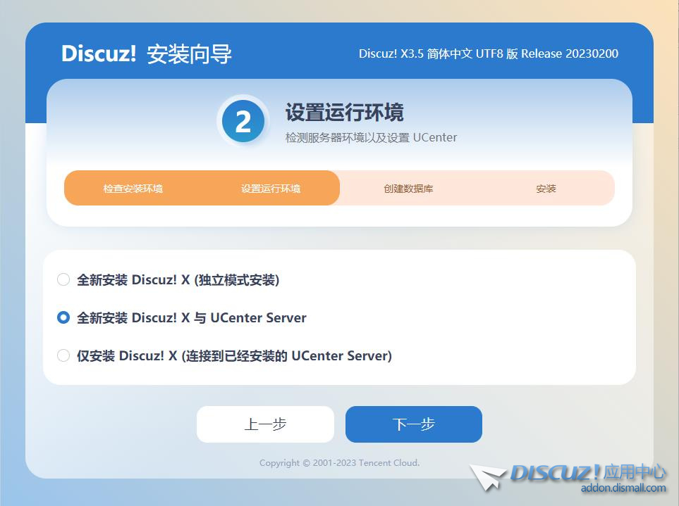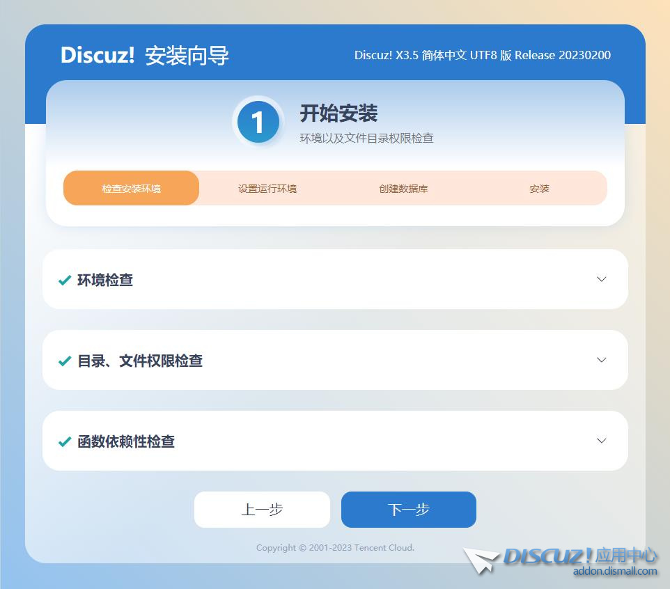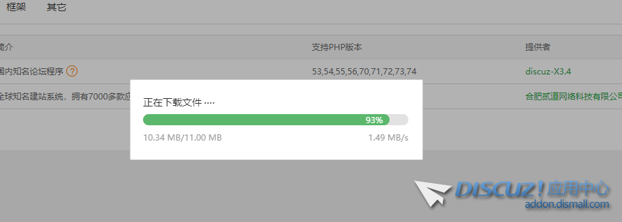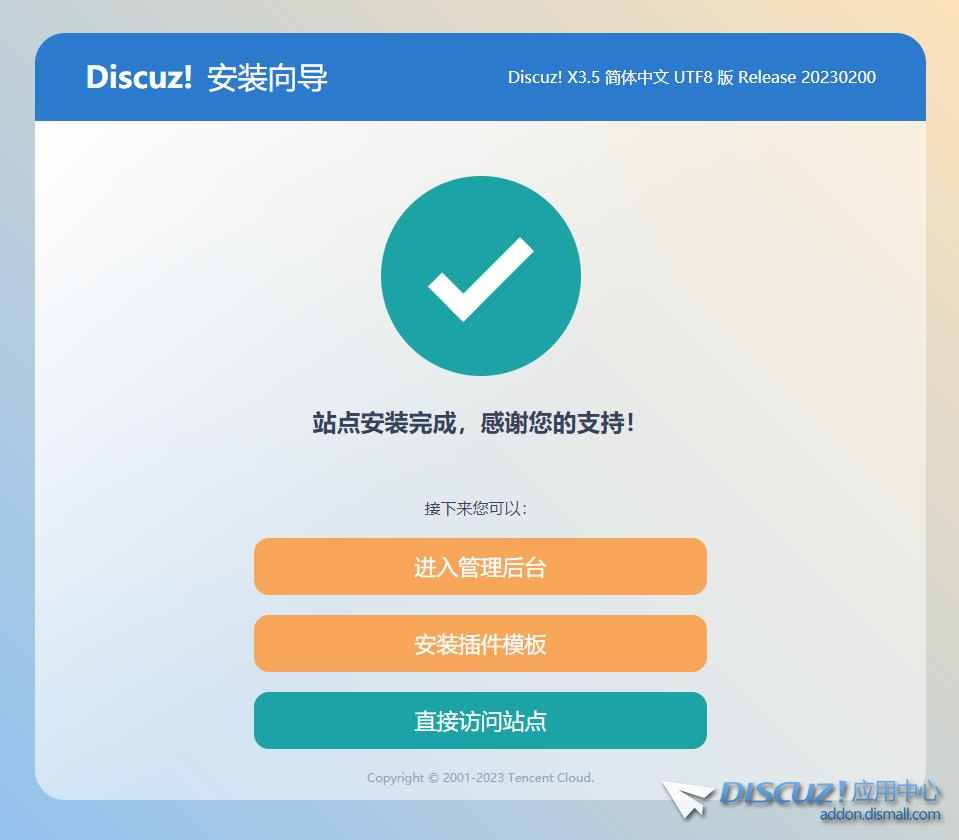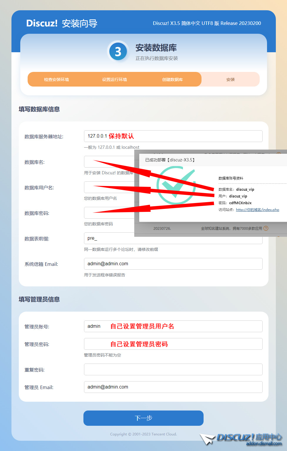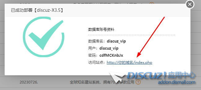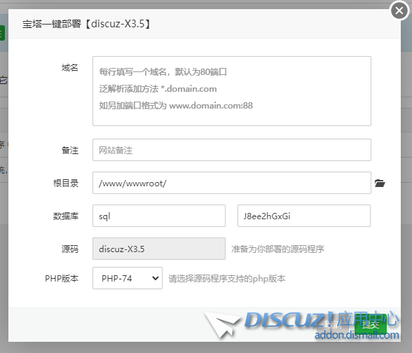 2、在软件商店选择“一键部署”分类,再搜索 discuz ,再点击一键部署Discuz! X3.5 ![]() 或者 ![]() 3、填上自己的域名,点击提交 ![]() discuz下载中 ![]() 4、下载完成,这里的数据库信息后边安装Discuz! X3.5 时会用到,点击提示里的网站链接,进入安装界面 ![]() 5、阅读授权协议后点击“我同意” ![]() 6、系统会自动检查环境及文件目录权限,检测成功,点击“下一步” ![]() 7、保持默认的 “全新安装 Discuz! X3.5 (含 UCenter Server)”,点击“下一步” ![]() 7、点击“下一步”,进入安装数据库的界面,如下图所示: 填写前边宝塔生成的数据库信息,并设置管理员账号和密码。 点击“下一步”,系统会自动安装数据库直至完毕,如下图所示: ![]() 安装中界面: ![]() 安装成功后,会出现如下的界面: ![]() 至此,Discuz! X3.5 已经成功地安装完毕!您可以登录 Discuz! X3.5 站点并开始设置了。 |