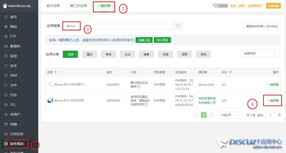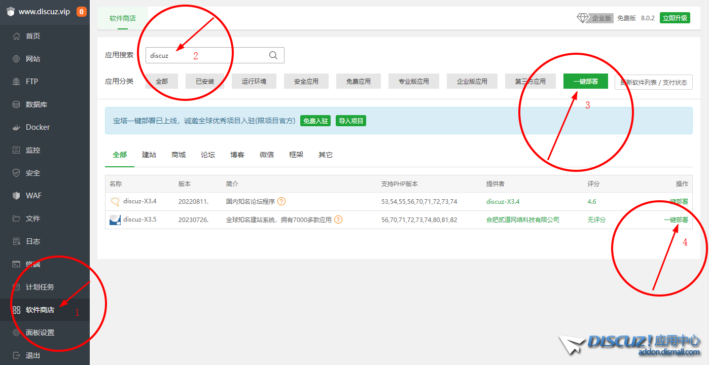 | *********************************************************** Discuz应用中心提供 免费代安装 Discuz!X3.5 ,点击查看详情 *********************************************************** 1、打开自己的宝塔面板,在软件商店安装 php 和 mysql