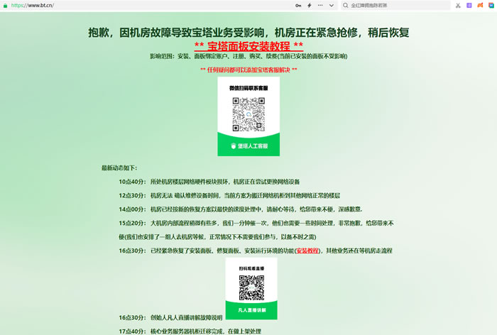 16点30分: 已经紧急恢复了安装面板、修复面板、安装运行环境的功能(安装教程),其他业务还在等机房走流程