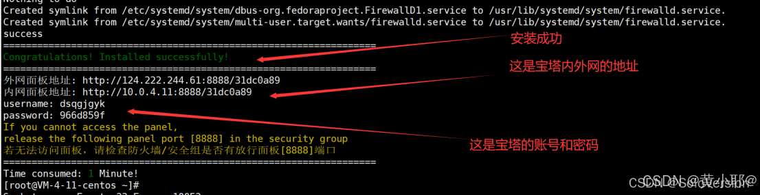 出现下面界面就代表你的宝塔安装成功了,一定要截图下面这张图片出现的地址,用户名,密码