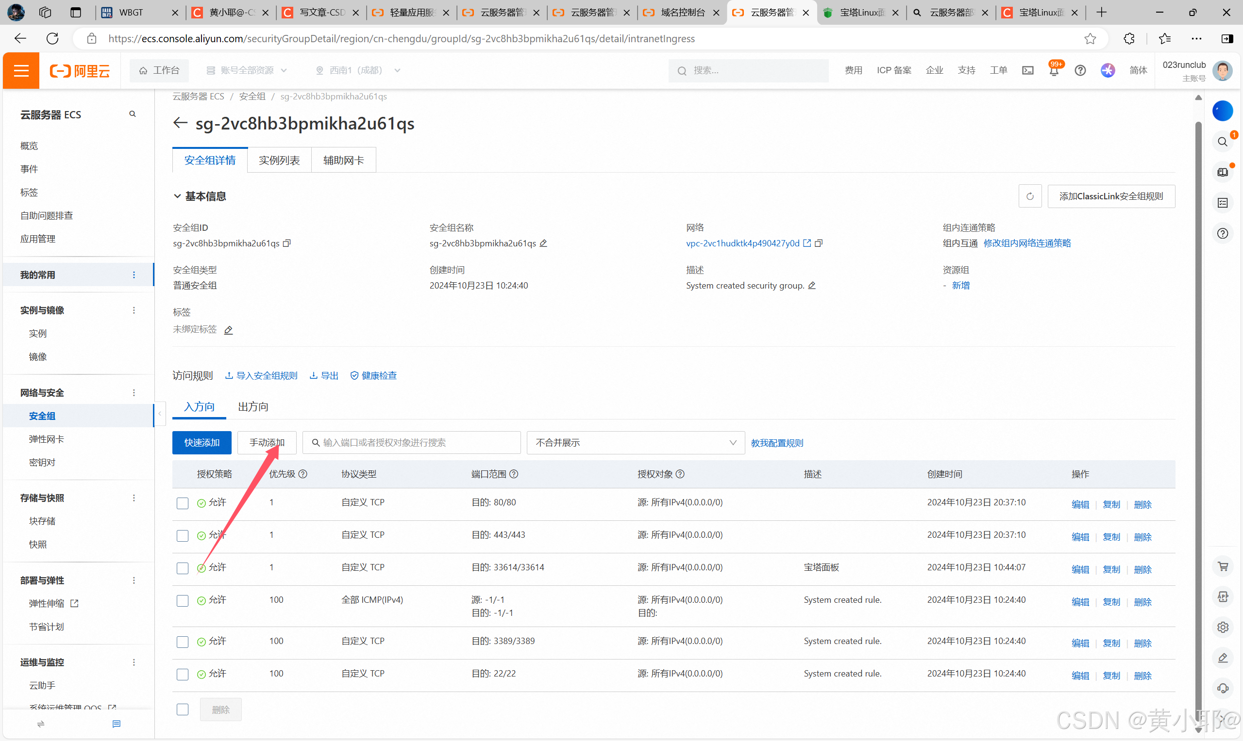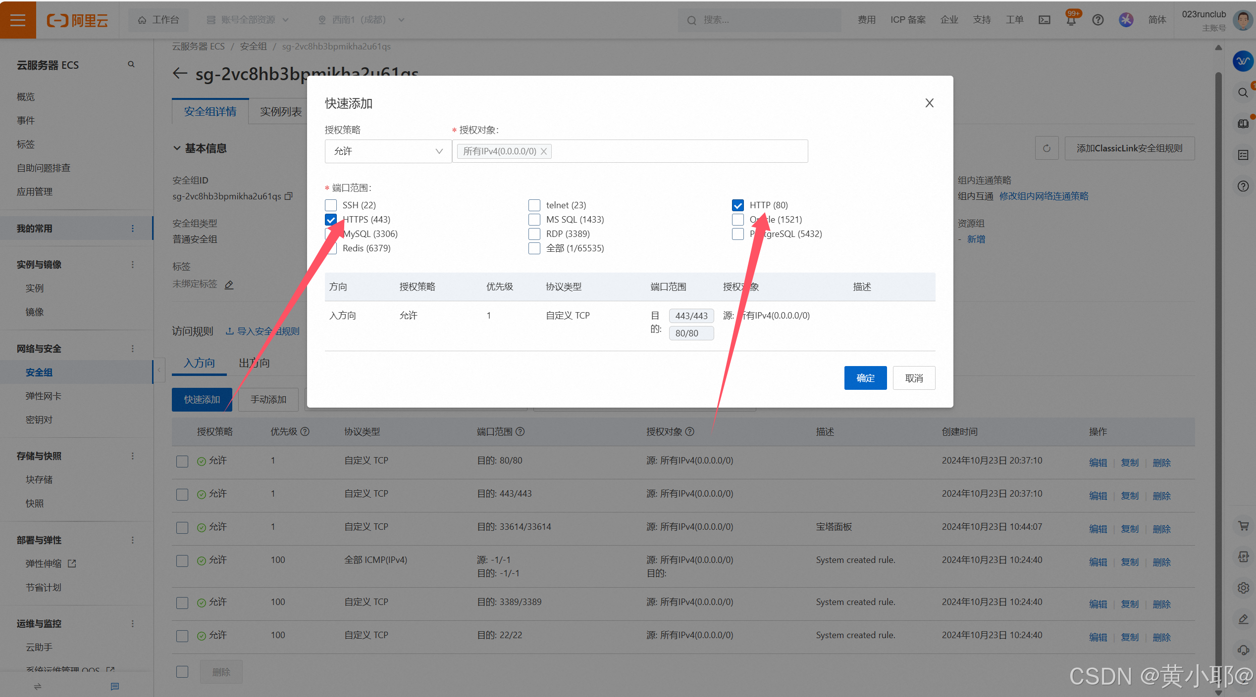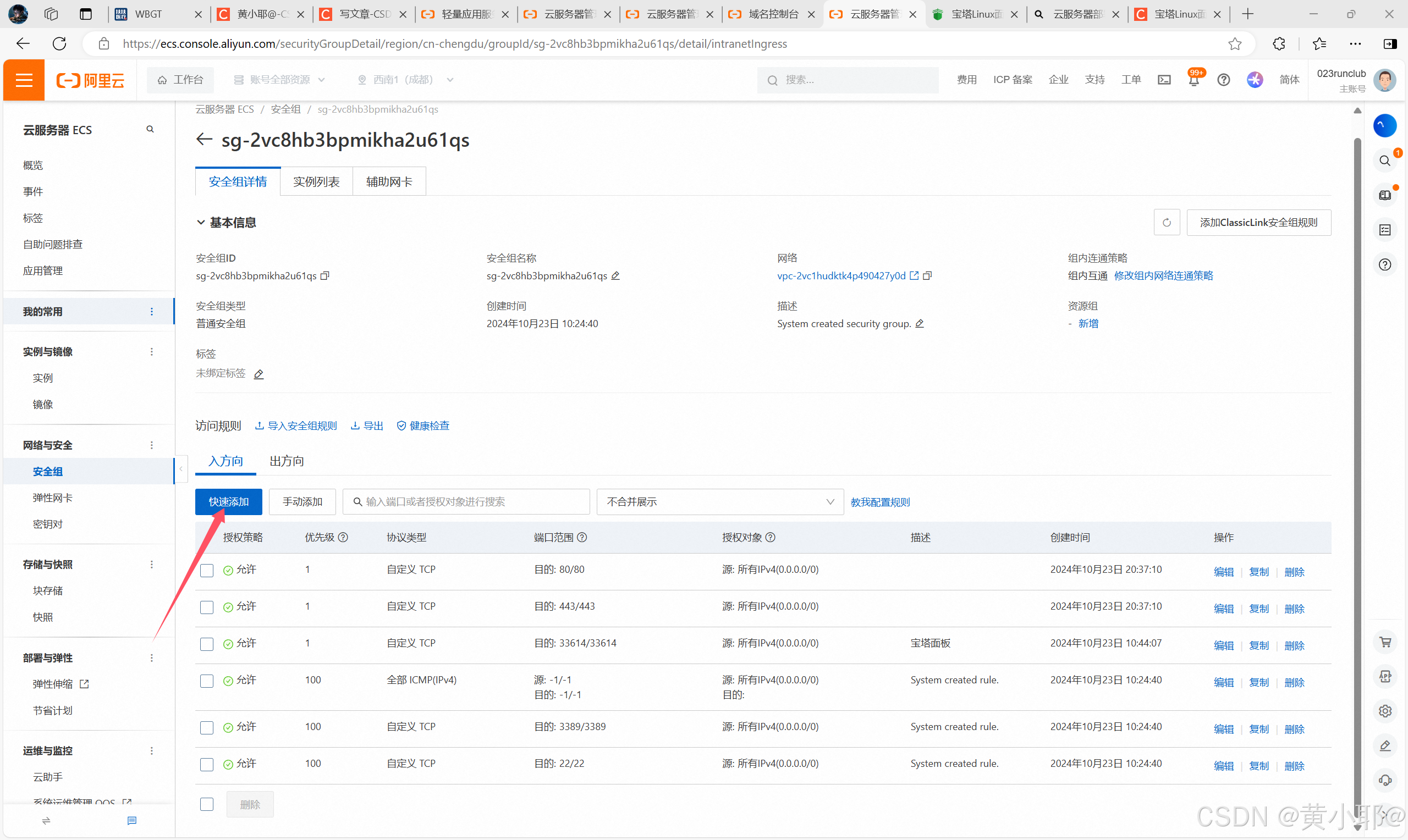 安全组类似防火墙功能,用于设置网络访问控制,使用好安全组规则,不仅可以保障我们应用的正常运行,还能在一定程度上有效防御各种攻击。安全组可以选择选时就设置好常用的端口,也可以之后再根据需求设置安全组端口,但是安全组是必须设置的,有些用户在阿里云服务器之后发现网站或应用总是无法使用,最后才发现是安全组相应的端口没有开通。例如如果你是部署网站,且要实现https访问的话,就必须开通HTTPS (TCP:443)端口。