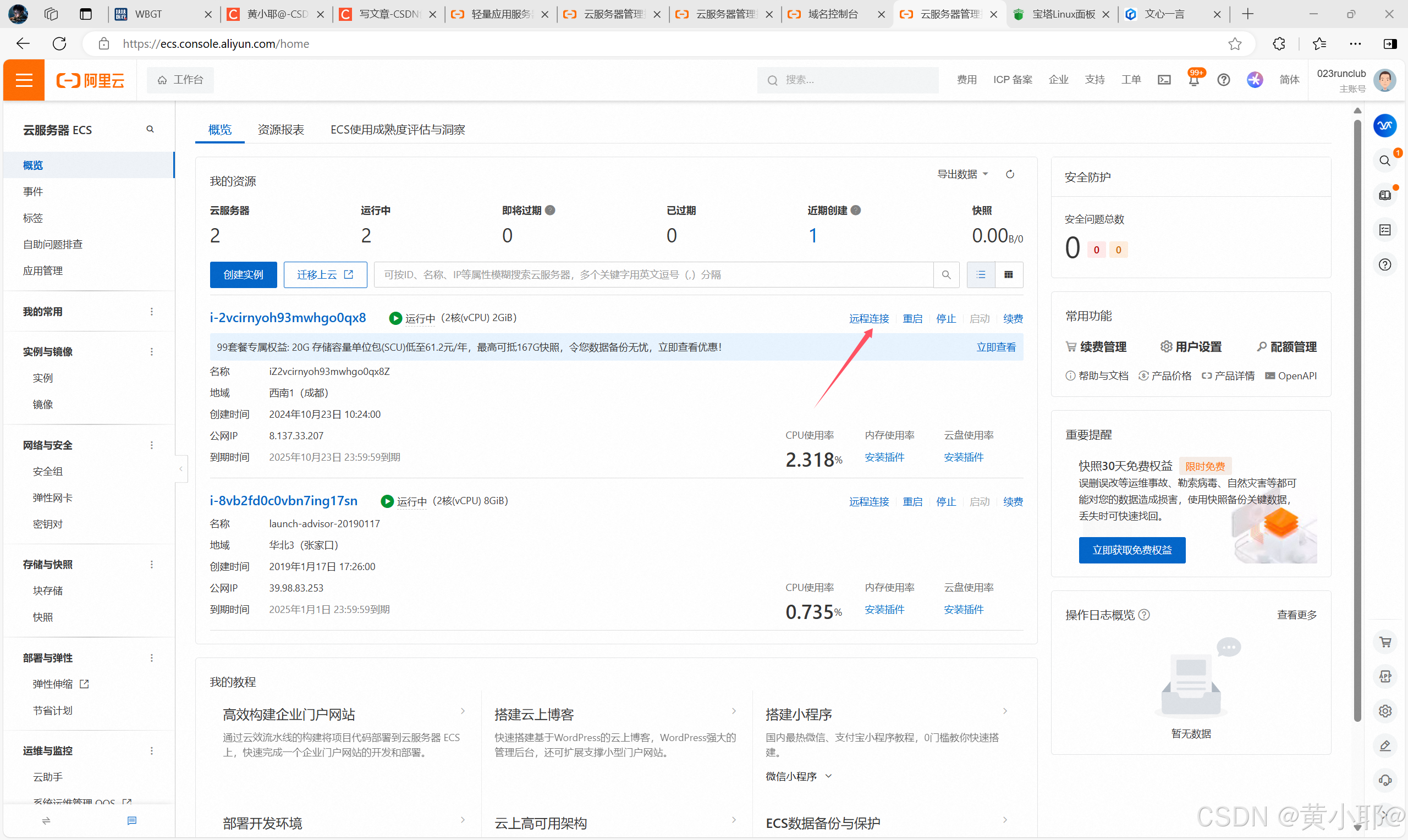 买完以后,点击云服务器ECS,来到云服务器控制台,点击远程连接,进入到如下页面