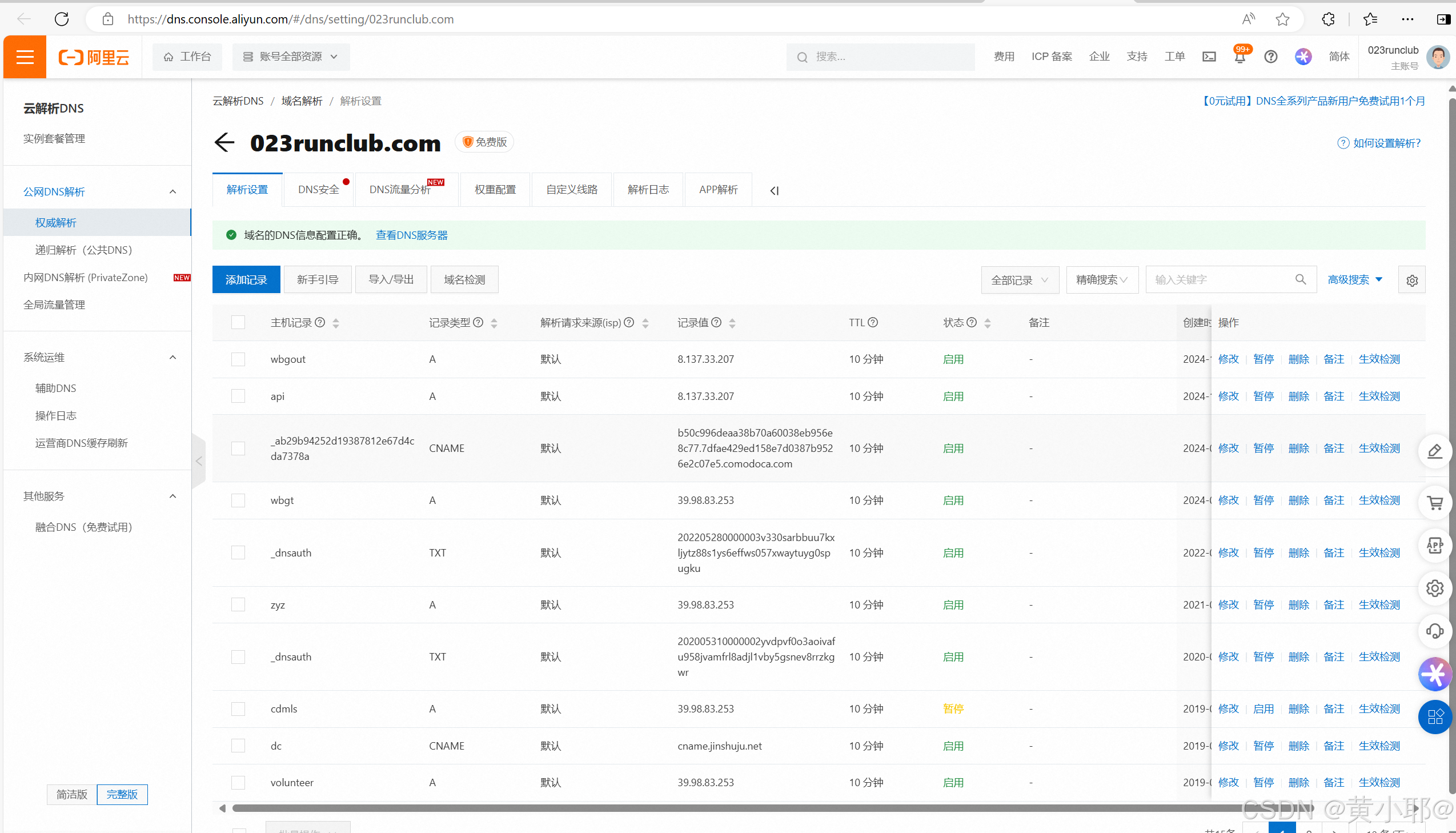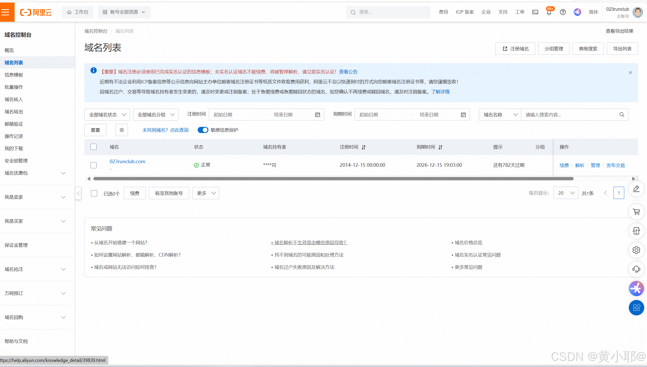 大家还没注册域名的小伙伴,首先需要去到阿里云里去注册一个域名,该网址为:域名注册_域名查询_域名申请_域名购买_域名续费_国际域名-万网-阿里云品牌,注册该域名需要进行一个备案处理,整个备案流程大概需要一周左右,完成备案后,来到域名控制台,点击域名列表,来到这个页面。