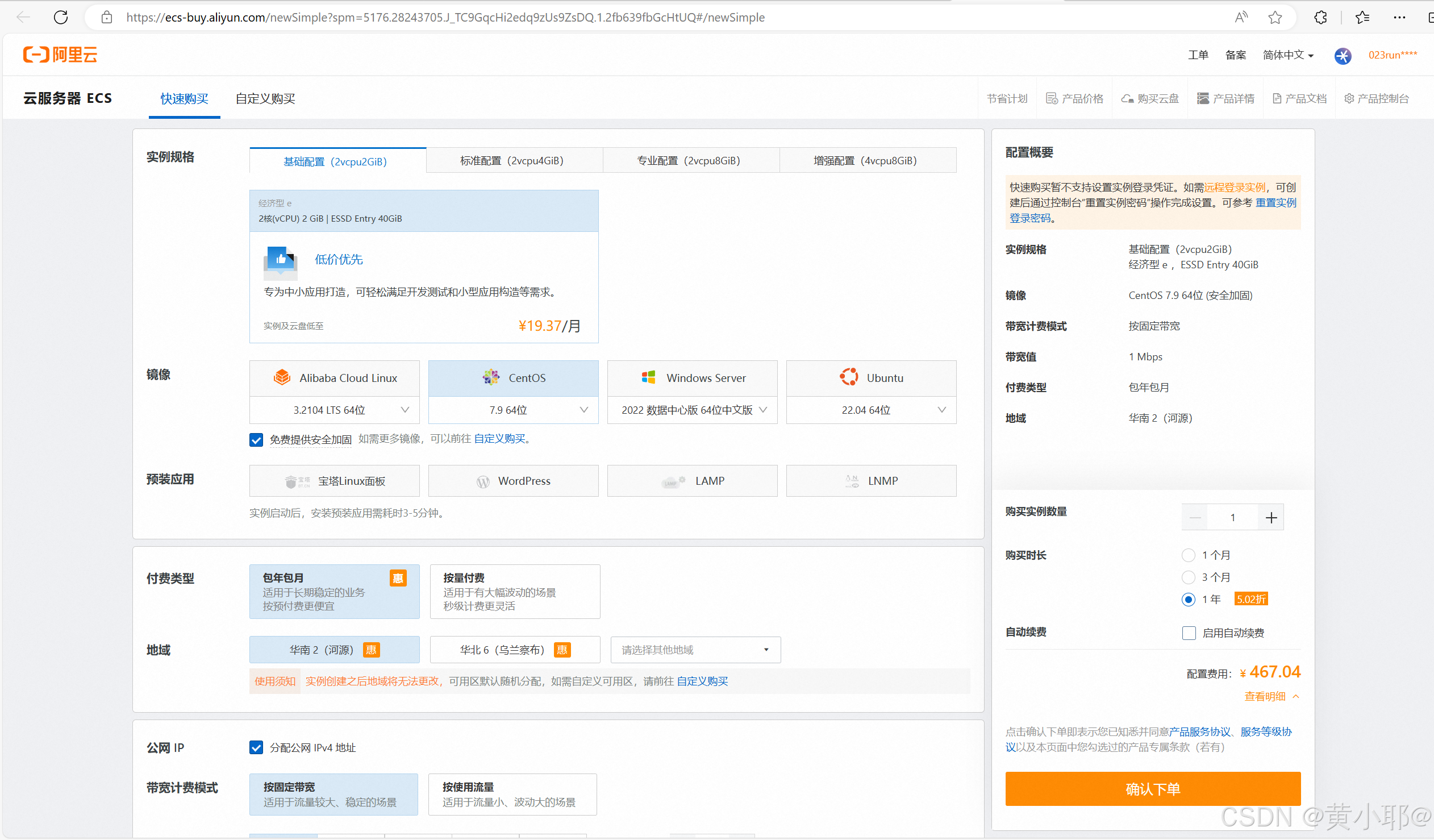 最后一步就是选择时长并支付订单了,需要注意的是,如果我们的实例用于web服务,中国内地必须完成ICP备案,备案实例(含续费)时长需在3个月及以上,否则是无法申请备案服务号去备案的。另外,选择年付的话,一般根据所选云服务器实例规格、用户身份(新用户与老用户)等条件给出一定的折扣。