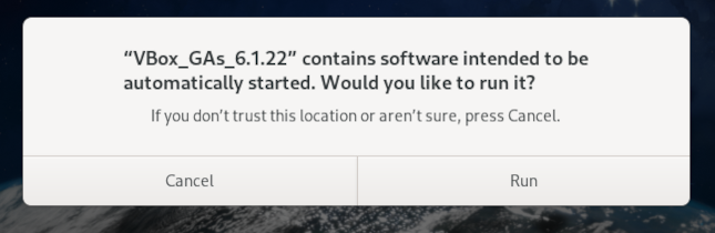 在大多数 Linux 发行版上,带有增强功能的 CD 镜像会自动挂载,并且能够在文件管理器中找到。Fedora 会问你是否要运行安装脚本。单击“运行(Run)”,并授予该安装进程 root 权限: