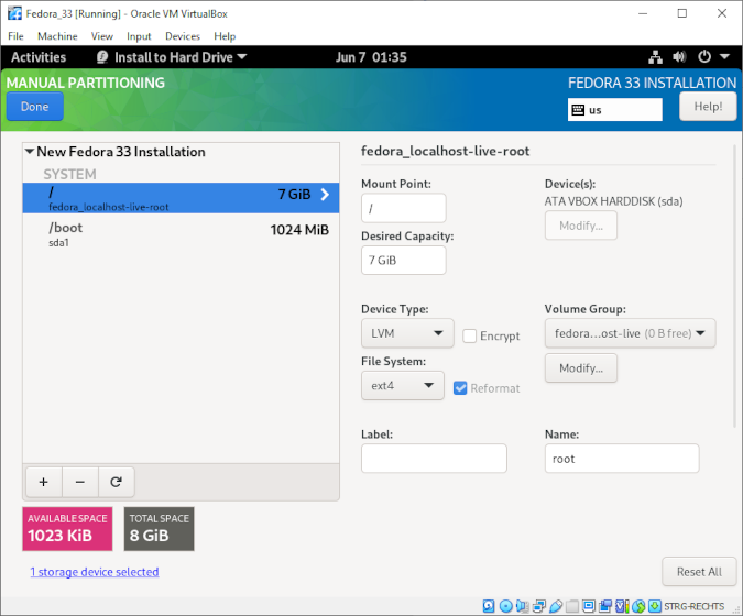 正如我提到的,Fedora 官网建议安装时分配 20GB 的磁盘空间。因为 8GB 是 Fedora 33 安装启动就需要的最少空间。没有安装其他软件(除了 VirtualBox 增强功能)的一个新安装的系统就几乎占用了整个 8GB 的可用空间。这时候,不要打开 GNOME 软件中心或任何其他可能从互联网下载文件的东西。