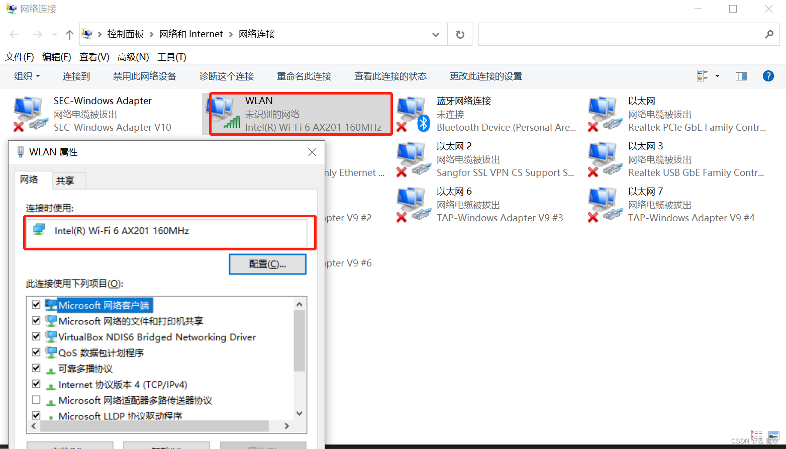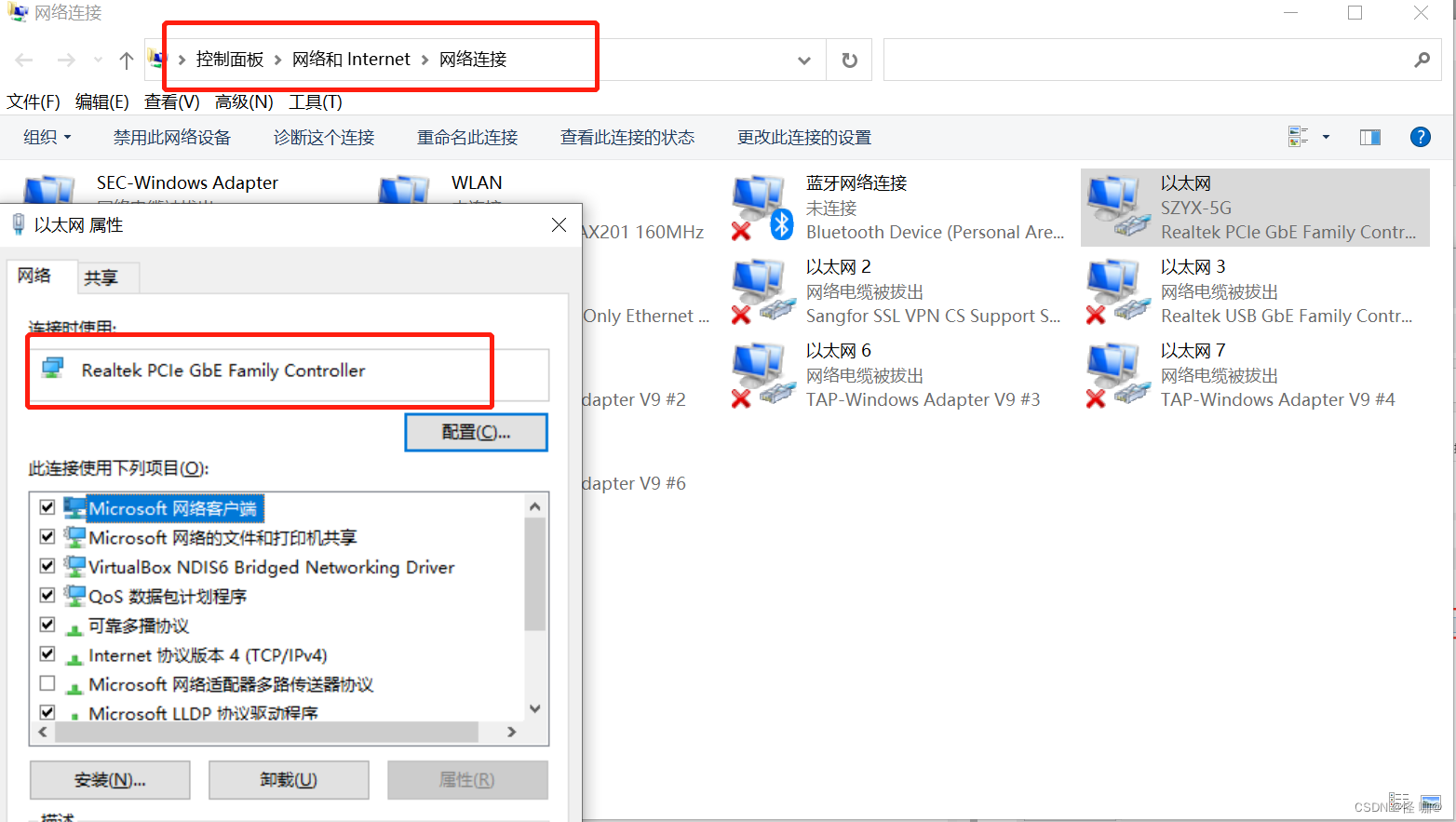 我们也可以看一下我们宿主机的网络连接,点击属性会发现就是这个名称。也就是虚拟机要和宿主机名称保持一致。