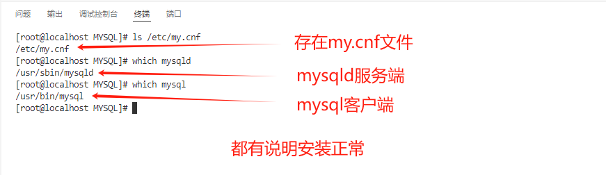 安装完成之后可以查看一下在/etc目录下是否存在my.cnf文件,是否有对应的mysqld服务端的应用程序,mysql客户端应用程序: