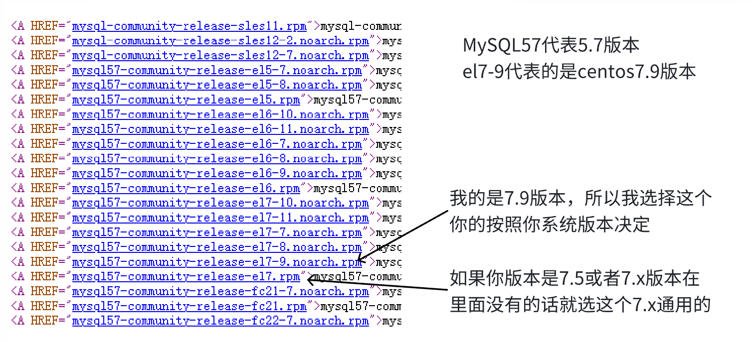 打开网址后页面显示可能不太完整,可以直接右键查看页面源代码,可以将细节显示的全一点,这里我以最常用的MySQL5.7版本为演示,然后以你的系统版本为准,上图我的系统版本是7.9,所以我这里就下载7.9的yum源: