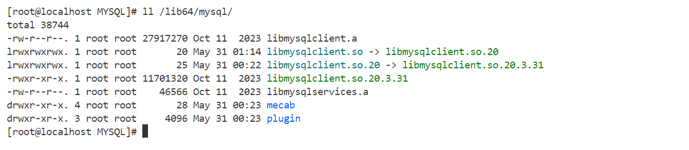 第二:查看lib64目录下有没有对应的MySQL打包好的动静态库,这个在上面安装MySQL服务的时候是已经一并安装了的了,如果没有那么确保一下MySQL服务有没有正确安装: