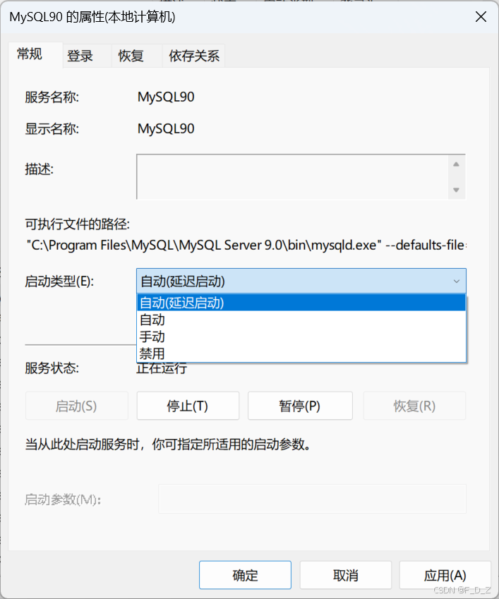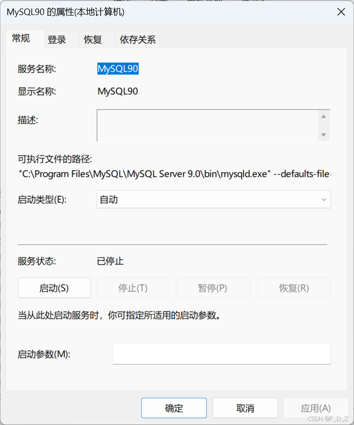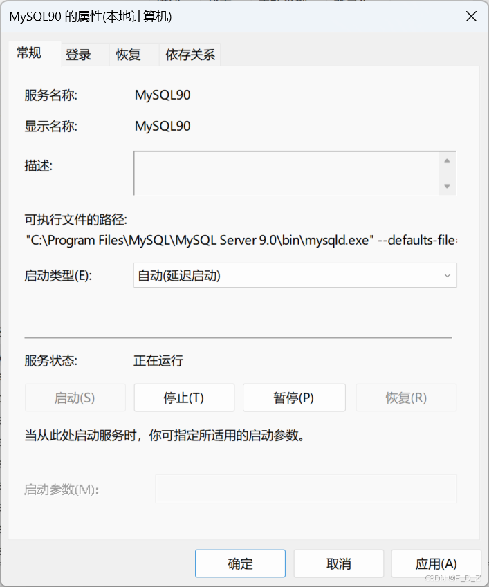 进入对应的MySQL服务可以看到服务名称,可执行文件路径,启动类型,服务状态等信息