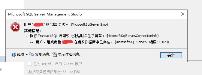 背景: 最近在迁移SQLServer数据库2019时,新建用户成功后,做用户映射失败。 SQLServer 报错:用户、组或角色'XXX' 在当前数据库中已存在. 错误:15023.