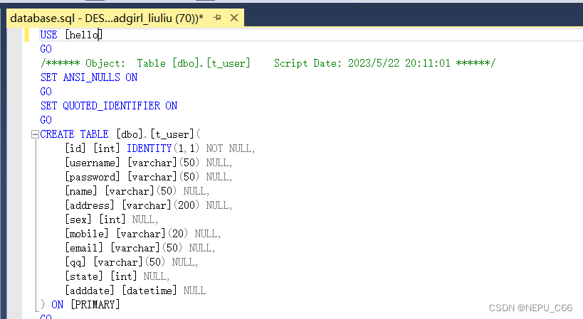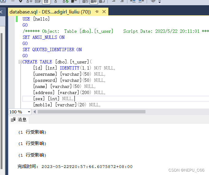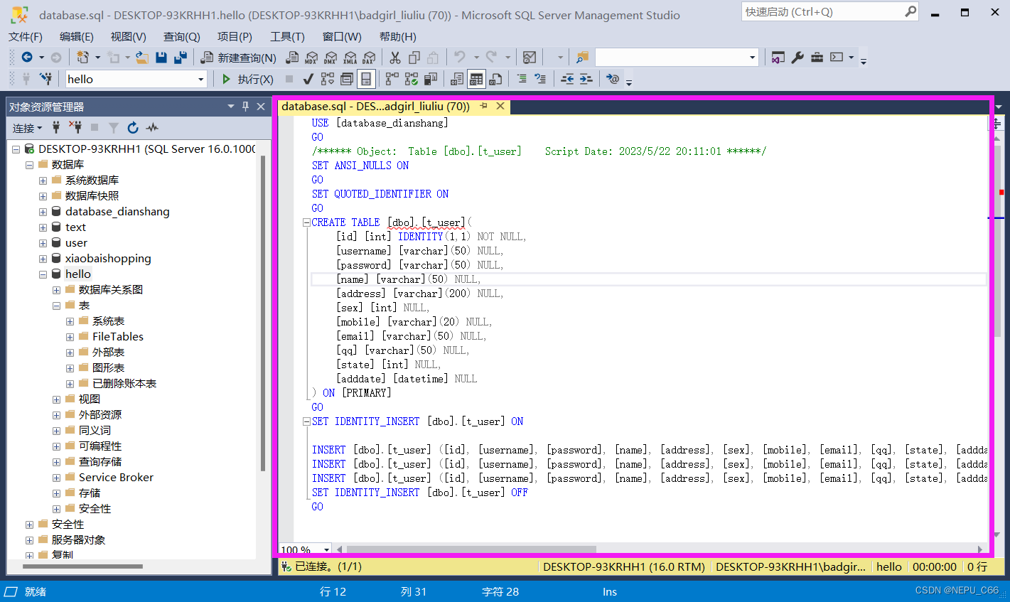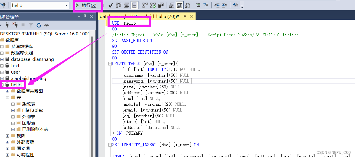5、执行当前脚本文件,在hello数据库下生成所需的数据表