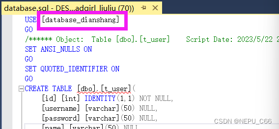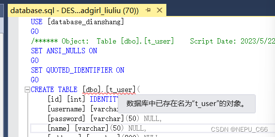 笔者名为“database_dianshang”的数据库下已经有名为“user”的数据库对象(名为user的表)了。