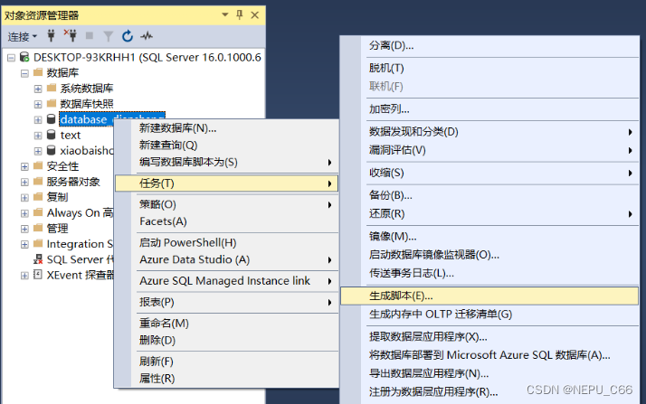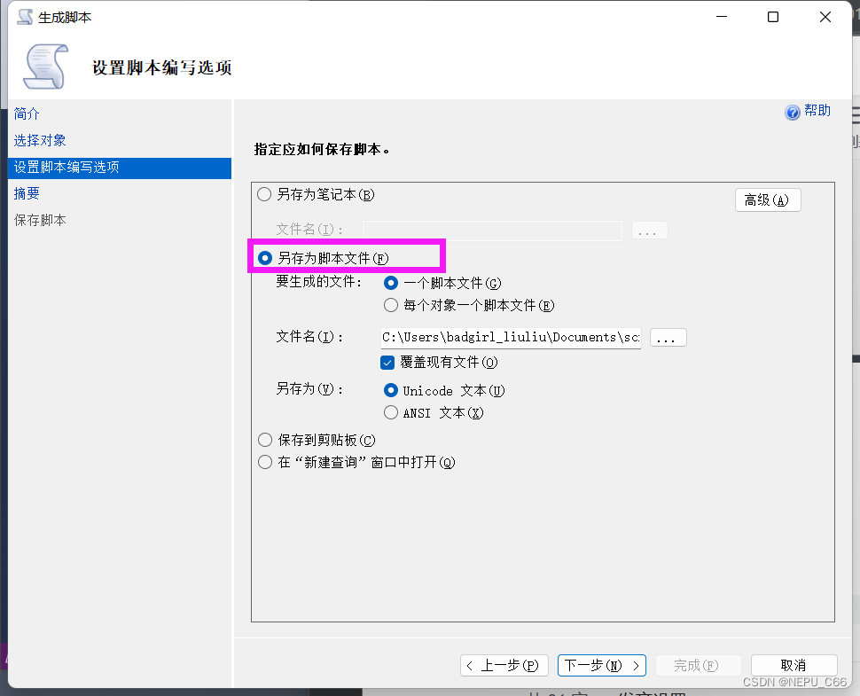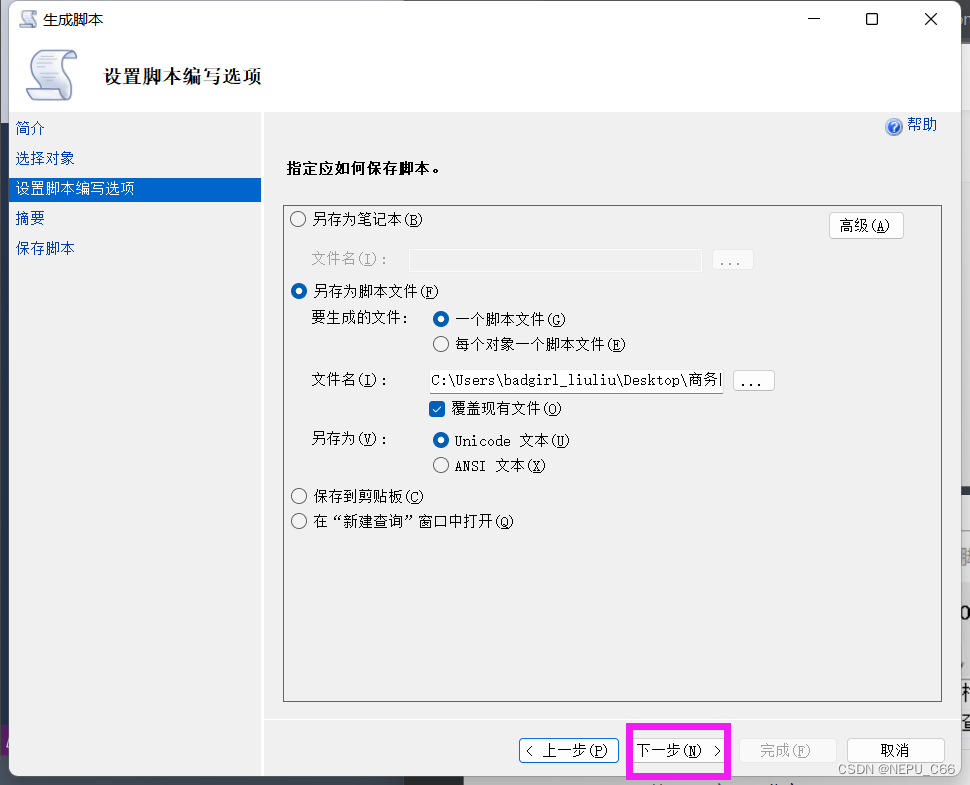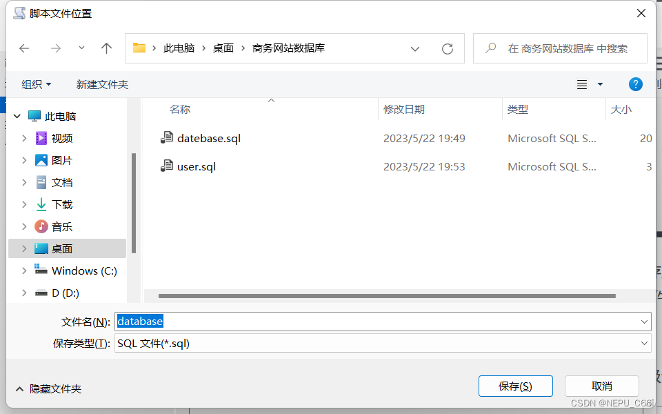 5、选择文件保存路径,以及生成的脚本文件名(此处将文件保存在了桌面名为商务网站数据库文件夹下,脚本文件名为database)