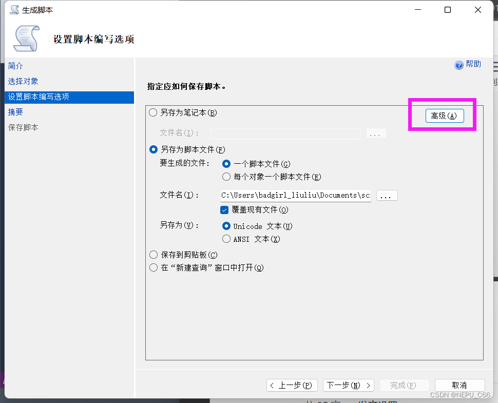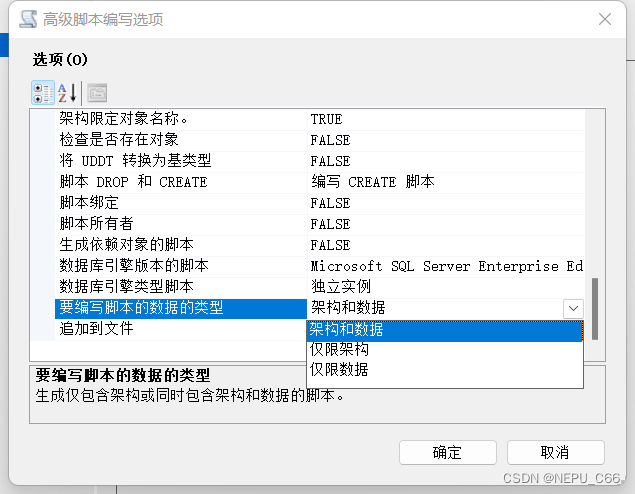6、点击选择高级设置,在“要编写脚本的数据的类型”中选择“架构和数据”,点击确定按钮。