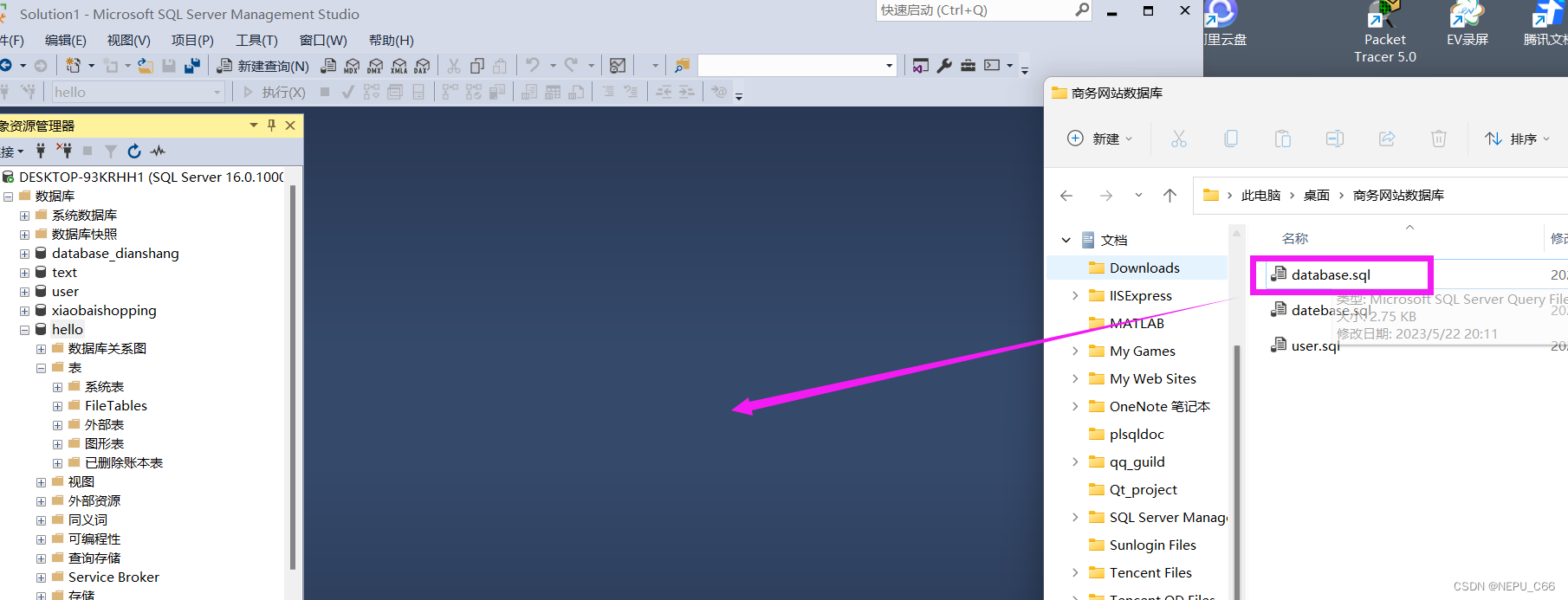 3、选中需要导入SQLServer中的数据库脚本文件,将其拖拽进入窗口