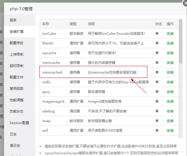 1. 需要你的服务器支持,就是你的 PHP 需要安装上 Memcached 扩展。一般情况下是没有安装的,比较如果你使用的宝塔管理面板,可以到PHP管理里面找到相关的插件下载,如下图: